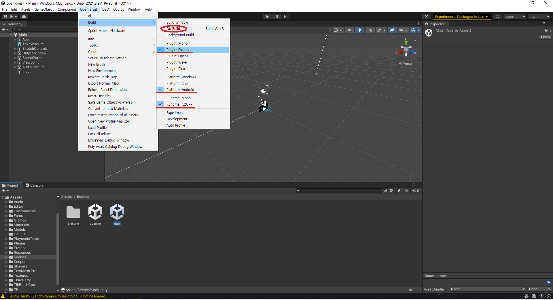 Open Brush > Build ์์ Plugin: Oculus, Platform: Android, Runtime: IL2CPP ๋ก ์ค์ ํ๊ณ 'Do Build'๋ฅผ ์ ํํฉ๋๋ค.