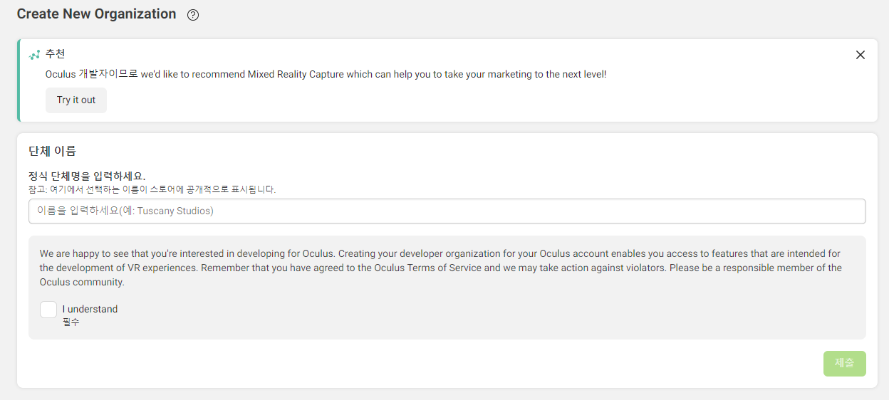 ๊ฐ๋ฐ์ ๋ฑ๋ก์ ์ํด ์๋ ๋งํฌ์์ organization์ ๋ง๋ค์ด์ผ ํฉ๋๋ค.