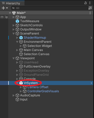 1. Hierarchy ์ฐฝ์์ 'VrSystem'์ ์ ํํฉ๋๋ค.