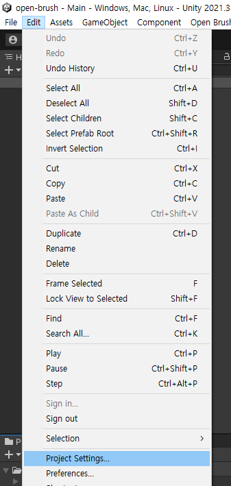 Edit - Project Settings ๋ฅผ ํด๋ฆญํฉ๋๋ค.