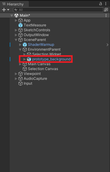 ๊ทธ๋ฆฌ๊ณ Main ์ฌ์ ์ถ๊ฐํฉ๋๋ค. ํ์ด์ด๋ผํค ์ฐฝ์ผ๋ก ๋ชจ๋ธ์ ๋๋๊ทธํ์ฌ ์ถ๊ฐํฉ๋๋ค. SceneParent > EnvironmentParent ์๋์ ์ถ๊ฐํฉ๋๋ค.