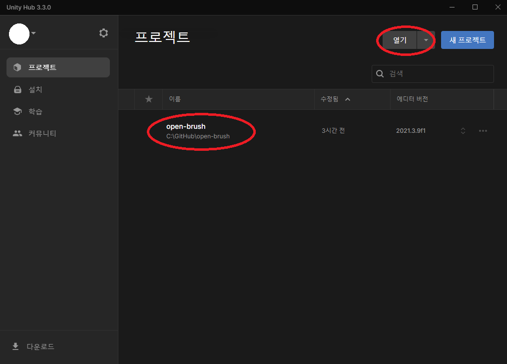 ์คํ ๋ธ๋ฌ์์ ๊ฐ์ ๋ฒ์ ์ธ Unity 2021.3.9f1 ์๋ํฐ๋ฅผ ์ค์นํฉ๋๋ค.