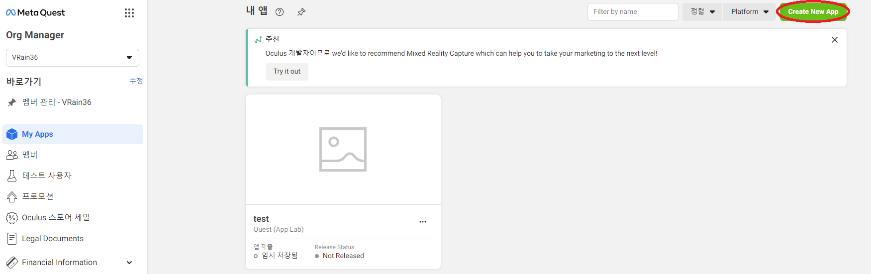 'Create new app'์ ํด๋ฆญํ์ฌ ํ ์คํธ ์ฉ ์ฑ์ ๋ง๋ญ๋๋ค. ์ ๋ 'test'๋ก ๋ง๋ค์์ต๋๋ค.