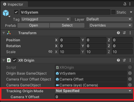 2. XR Origin ์ปดํฌ๋ํธ์ 'Tracking Origin Mode'๋ฅผ 'Not Specified'๋ก ๋ณ๊ฒฝํ๊ณ , 'Camera Y Offset'์ 0์ผ๋ก ๋ณ๊ฒฝํฉ๋๋ค.
