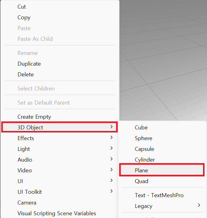 ํ์ด์ด๋ผํค ์ฐฝ์์ ์ค๋ฅธ์ชฝ ๋ง์ฐ์ค๋ฅผ ๋๋ฌ [3D Object - Plane]์ ์ ํํด ๋ฐ๋ฅ์ ๋ง๋ค์ด ์ค๋๋ค.