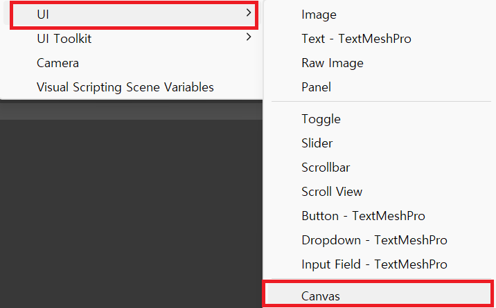ํ์ด์ด๋ผํค ์ฐฝ์์ ์ค๋ฅธ์ชฝ ๋ง์ฐ์ค๋ฅผ ๋๋ฌ [UI - Canvas]์ ์ ํํด Canvas๋ฅผ ์ถ๊ฐํ๊ณ , ์ด๋ฆ์ 'Menu Canvas'๋ก ์ค์ ํ๊ฒ ์ต๋๋ค.