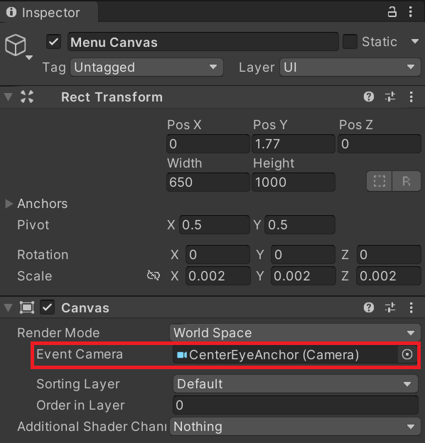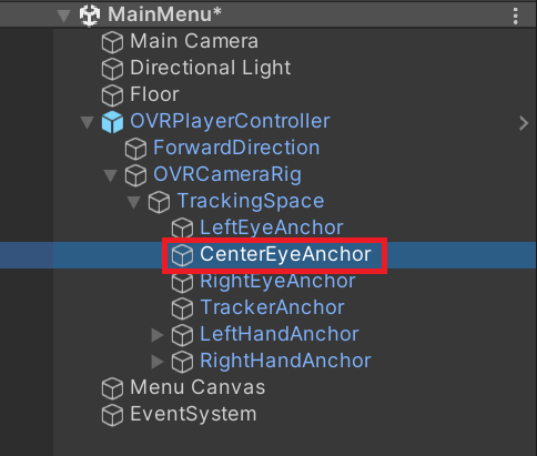 [Canvas - Event Camera]์ OVRPlayerController์ 'CenterEyeAnchor'์ ์ถ๊ฐํฉ๋๋ค.