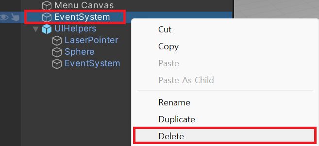 UIHelpers์ EventSystem์ด ์๊ธฐ ๋๋ฌธ์, ๊ธฐ์กด์ EventSystem์ ์ญ์ ํฉ๋๋ค.