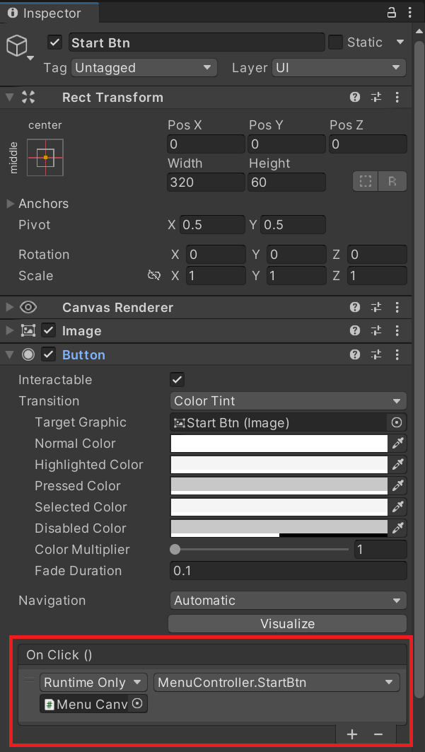 ์ด์ ๋ค์ Start ๋ฒํผ์ผ๋ก ๋์๊ฐ์, On Click()์์ +๋ฅผ ๋๋ฌ ํญ๋ชฉ์ ์ถ๊ฐํ ๋ค์, Menu Canvas ์ค๋ธ์ ํธ๋ฅผ ์ถ๊ฐํ๊ณ , [MenuController - StartBtn()]์ ์ ํํฉ๋๋ค.