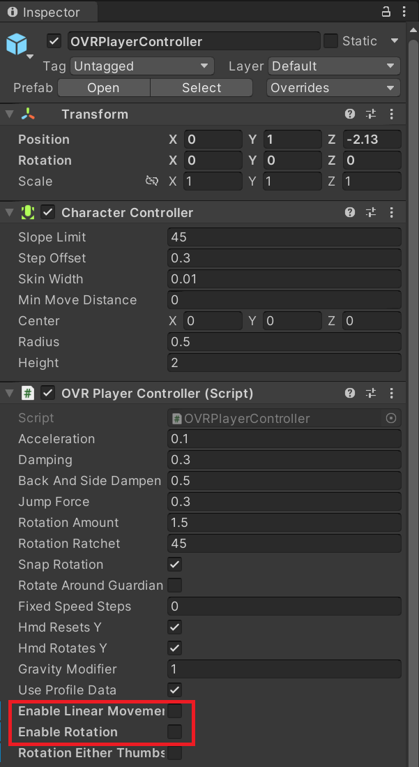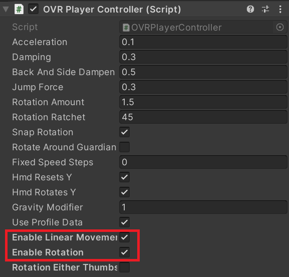 OVRPlayerContoller์ OVRPlayerController ์คํฌ๋ฆฝํธ์์ Enable Linear Movement์ Enable Rotation์ ์ฒดํฌ๋ฅผ ํ์ด์ค๋๋ค.