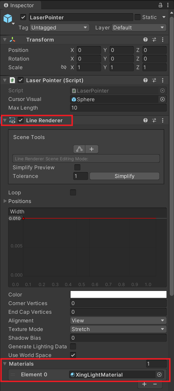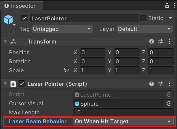 ๋๋ค๋ฅธ ์ค์ ์ ์ํด 'LaserPointer' Script๋ฅผ ์์ ํฉ๋๋ค.