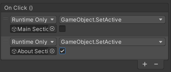 On Click()์๋ 'About Section'์ ๋ฃ๊ณ , [GameObject - SetActive(bool)] ๋ก ์ค์ ํฉ๋๋ค.