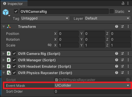 3D Object์ ์ํธ์์ฉํ ์ ์๋๋ก[OVRPlayerController - OVRCameraRig]์ 'OVRPhysicsRaycaster' ์คํฌ๋ฆฝํธ๋ฅผ ์ถ๊ฐํฉ๋๋ค.